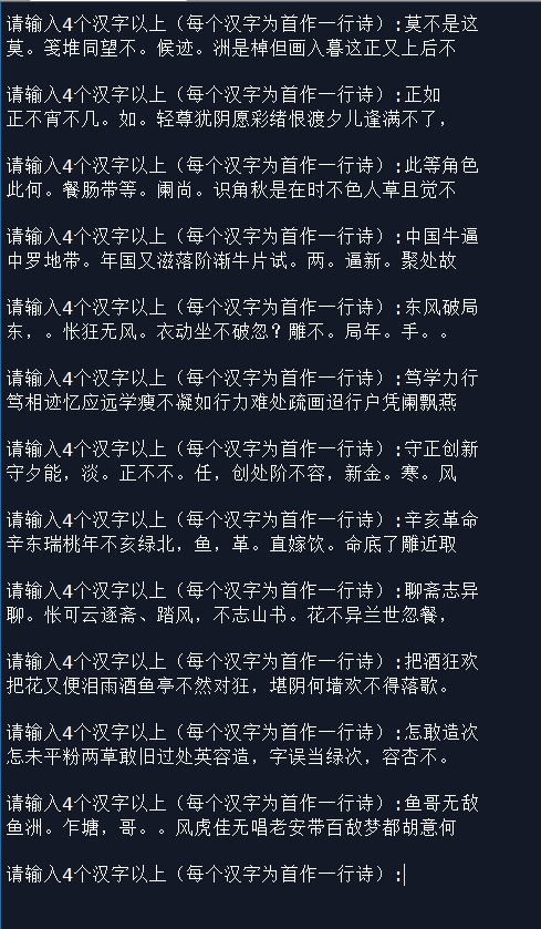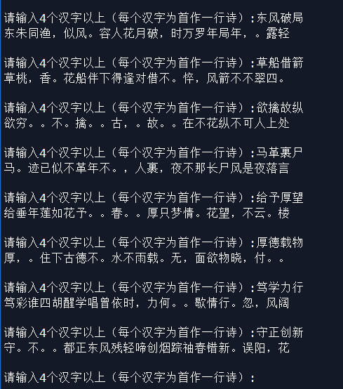 text = input('请输入4个汉字以上(每个汉字为首作一行诗):')