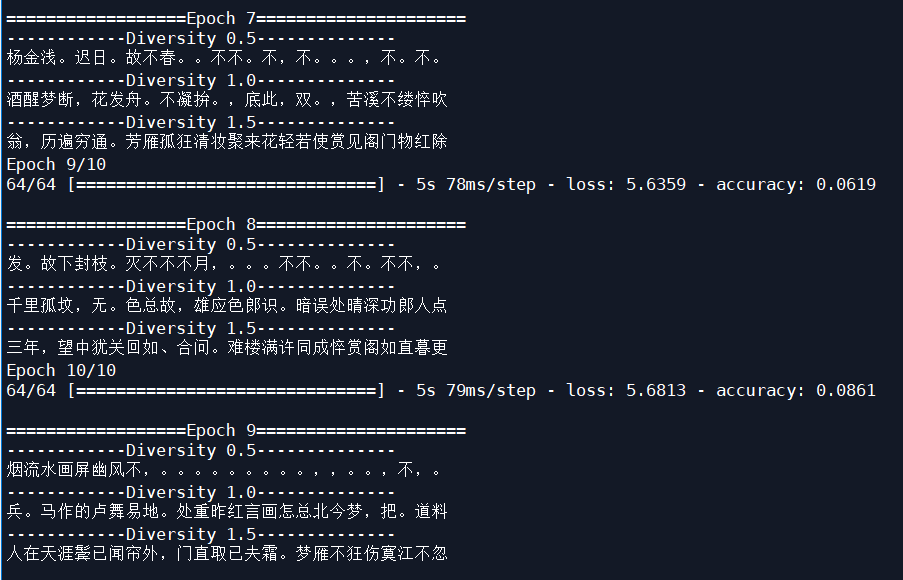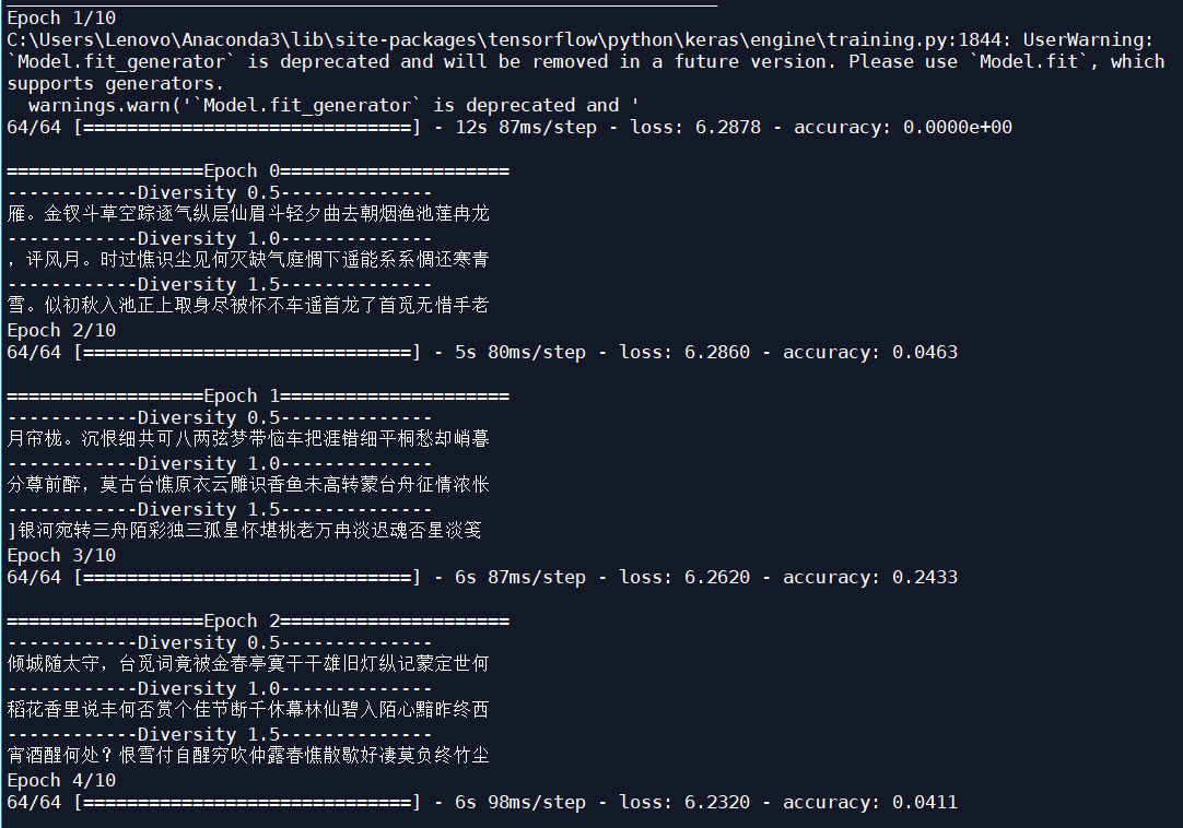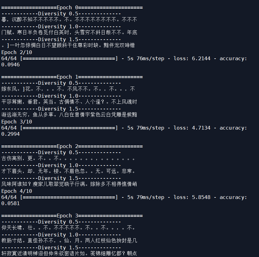 显然,把学习率改为0.0001后,LSTM模型生成宋词的效果要好很多。
