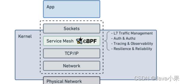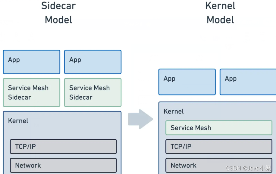 Cilium 直接通过 eBPF 技术实现的 Service Mesh 相比我们常规的 Istio/Linkerd 等方案,最显著的特点就是将 Sidecar proxy 模型替换成了 Kernel 模型, 如下图: