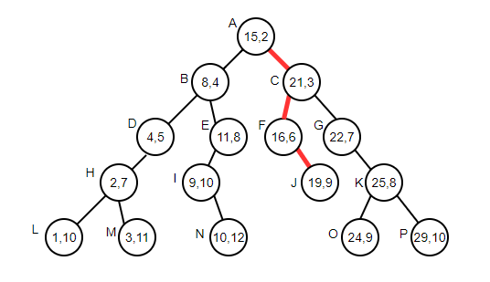 以插入一个权值为20的节点为例:首先从根开始,找到新节点对应的位置,它的位置应该位于节点 J J J的右儿子处。于是我们得到一条从 A A A到 J J J的路径,将这条路径上的边全部断开,小于等于20的点分到左侧;大于20的点分到右侧,于是得到了两棵树:如下图: