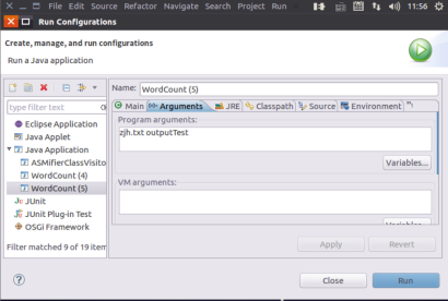 在Arguments选项中进行设置。这里我是直接用zjh.txt当input文件输入,自定义了outputTest文件夹存放运行结果生成的文件。