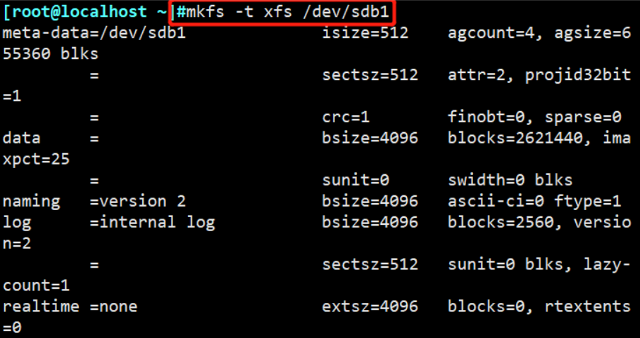[root@localhost~]# mkfs -t xfs /dev/sdb1