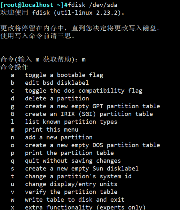 使用fdisk /dev/sda 进入交互模式才能使用以上指令