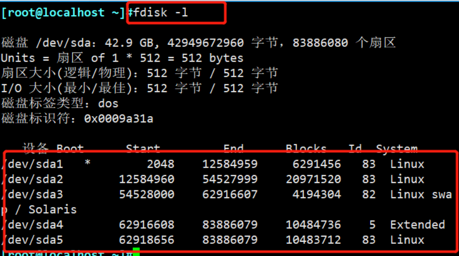 使用 fdisk 命令查看磁盘分区,从下图可以看出目前只有一个磁盘sda,其中该磁盘的sda1\sda2\sda3为主分区,其中sda3为交换模式,sda4为扩展分区,sda5为逻辑分区。