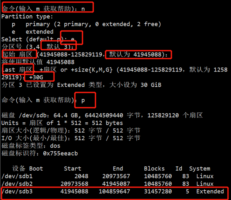 接着创建一个扩展分区,注意,创建扩展分区的选项是“e”,该分区空间可以大些,因为之后的额逻辑分区是从扩展分区分出去的。