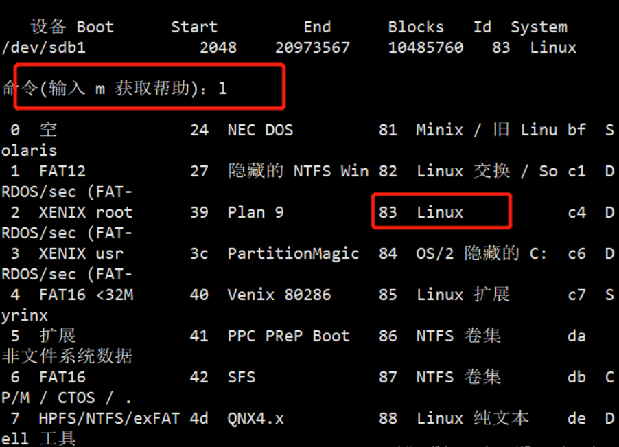 Id:分区对应的系统 ID 号。例如,83表示Linux中的XFS分区或EXT4分区、82代表交换文件系统、8e表示LVM逻辑卷。