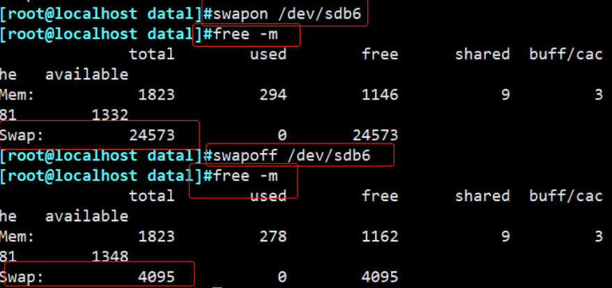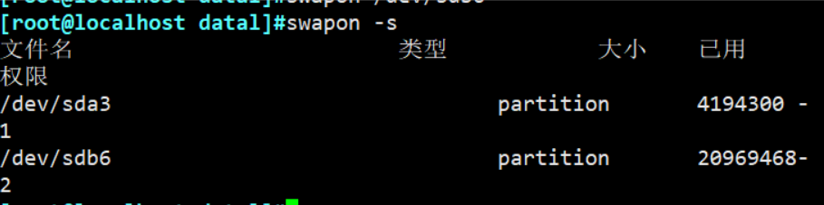 使用swapon /dev/sdb6 命令启用swap,发现空间变大,可在里面进行操作;使用swapoff /dev/sdb6命令关闭swap,空间变小。