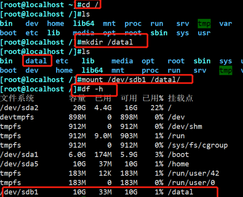 当分区全部格式化完成后,想要使用该磁盘(文件系统)时,需要将该磁盘挂载在一个挂载点上(即一个目录上),所以需要在根目录下创建一个新的挂载目录。