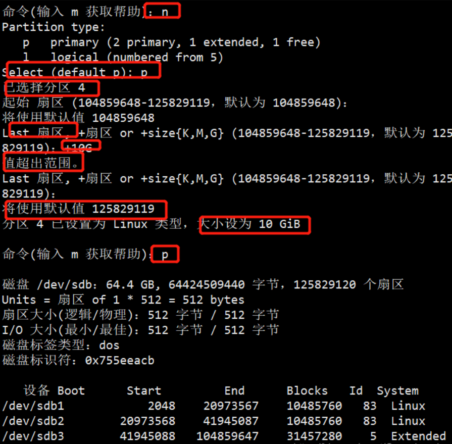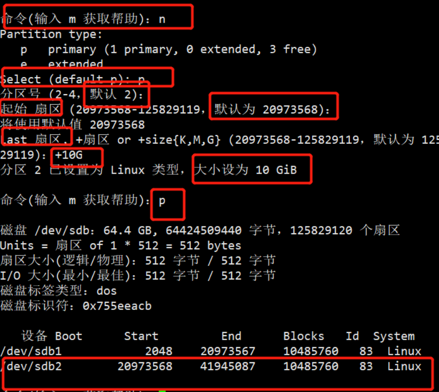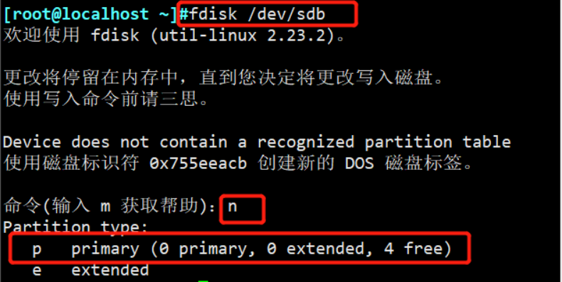 创建好新的磁盘以后,使用fdisk /dev/sdb命令进入新的磁盘,然后使用“n”选项开始创建分区。创建分区一开始会提示有多少主分区,多少扩展分区和可用分区有多少