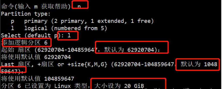接着可以创建逻辑分区了,注意创建逻辑分区的选项是“l”,其他操作如之前创建主分区一样。还有注意的是逻辑分区都是从“5”开始。