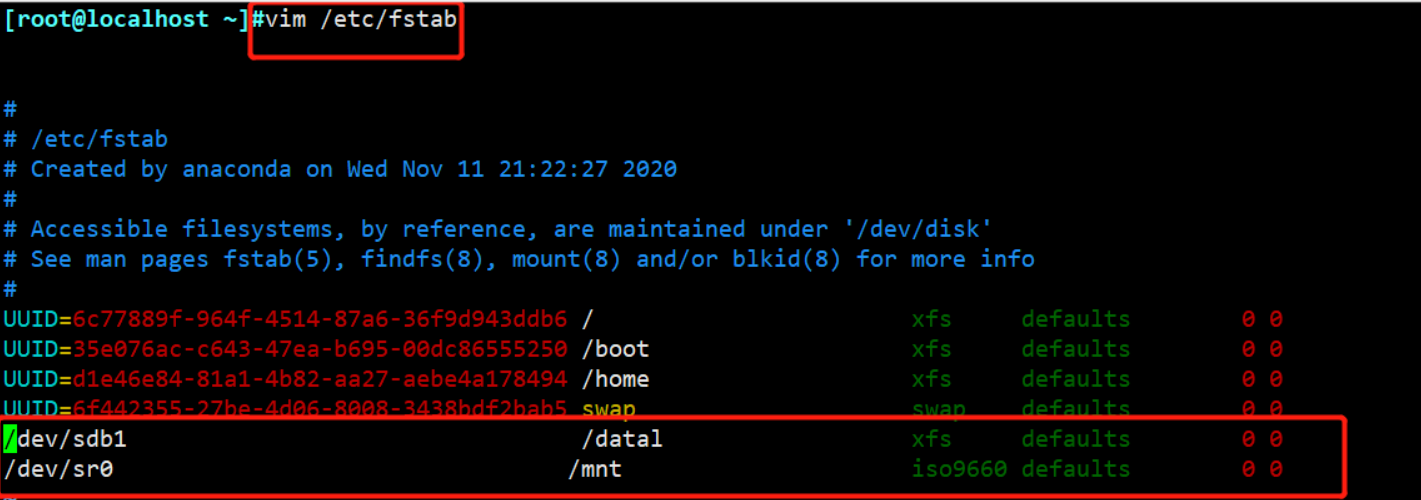 Linux操作系统在每次开机时,会自动读取 /etc/fstab 文件的内容,自动挂载所指定的文件系统。所以需要在该文件中将需要自动挂载的文件保存进去。
