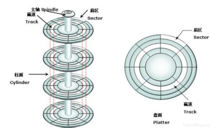 3、柱面:不同盘片相同半径构成的圆柱面,由同一半径圆的多个磁道组成