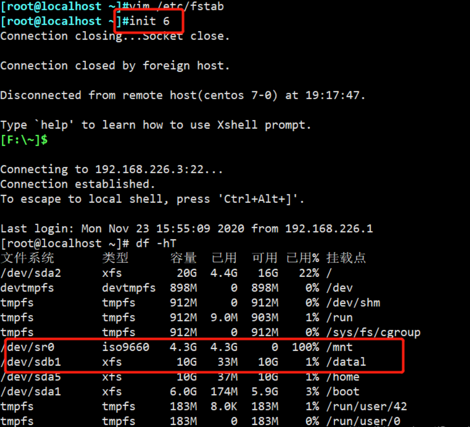 “wq”保存以后,使用“init 6”命令重启,也将虚拟机重启一下,然后重新连上后发现两个文件已经自动挂载了。