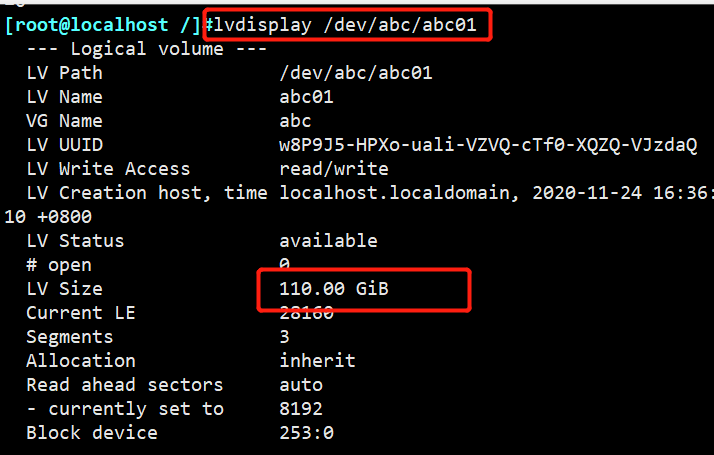 使用lvdisplay 命令查看扩展后的逻辑卷空间大小。