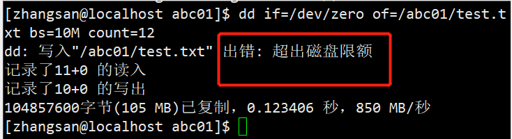 使用以下的命令查看zhangsan磁盘容量限制。发现限额已经设置成功。