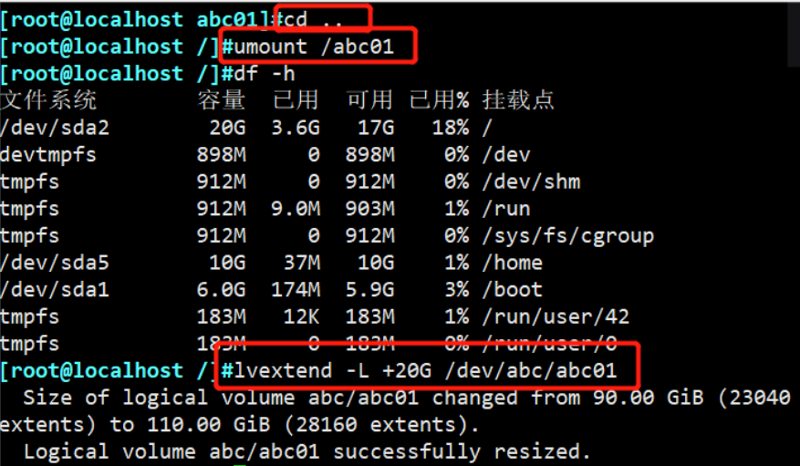 当想要扩展逻辑卷大小的时候,使用“lvextend”命令扩展。注意扩展之前不能在该逻辑卷中,该逻辑卷可以不解挂载就能编辑,也可解挂载之后编辑,而且扩展的空间之前一定要有"+",否则则是将原来的空间更改为20G,而不是扩展。这里将逻辑卷扩展20G。