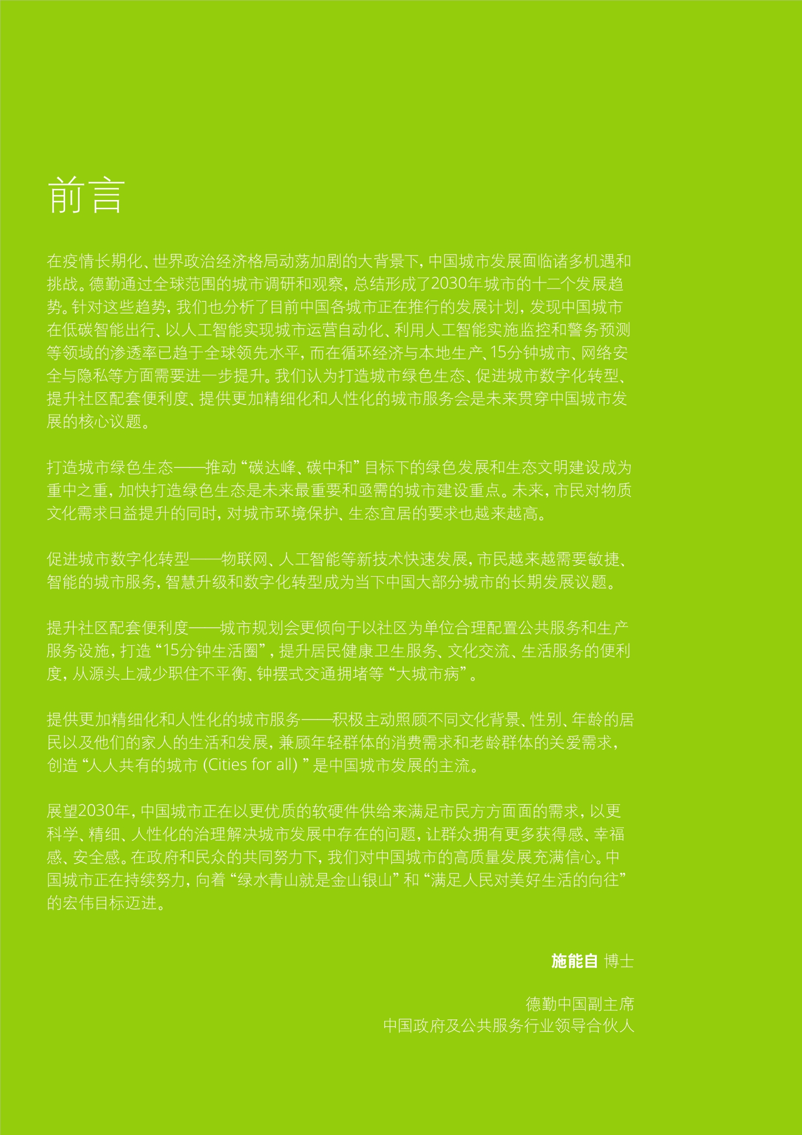 打造城市绿色生态-推动“碳达峰、碳中和”目标下的绿色发展和生态文明建设成为重中之重,加快打造绿色生态是未来最重要和亟需的城市建设重点。未来,市民对物质文化需求日益提升的同时,对城市环境保护、生态。宜居的要求也越来越高。促进城市数字化转型--物联网、人工智能等新技术快速发展,市民越来越需要敏捷、智能的城市服务,智慧升级和数字化转型成为当下中国大部分城市的长期发展议题。