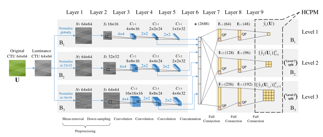 一个64×64的CTU一共有 1 + ( 1 + ( 1 + 1 ) 4 ) 4 = 83522 1+(1+(1+1)^4)^4=83522 1+(1+(1+1)4)4=83522种划分模式,因为划分模式众多,直接一次性预测出HCPM不太现实(intractable),而且模型的稳健性也不强,所以采用分阶段的产生三层HCPM, y ^ 1 ( U ) \hat{y}_1(U) y^1(U)、 { y ^ 2 ( U i ) } i = 1 4 \{\hat{y}_2(U_i)\}_{i=1}^4 {y^2(Ui)}i=14和 { y ^ 3 ( U i , j ) } j = 1 4 \{\hat{y}_3(U_{i,j})\}_{j=1}^4 {y^3(Ui,j)}j=14。(due to the enormous patterns of the CU partition, the prediction should be made step by step in a hierarchy to yield y_1, y_2 and y_3)