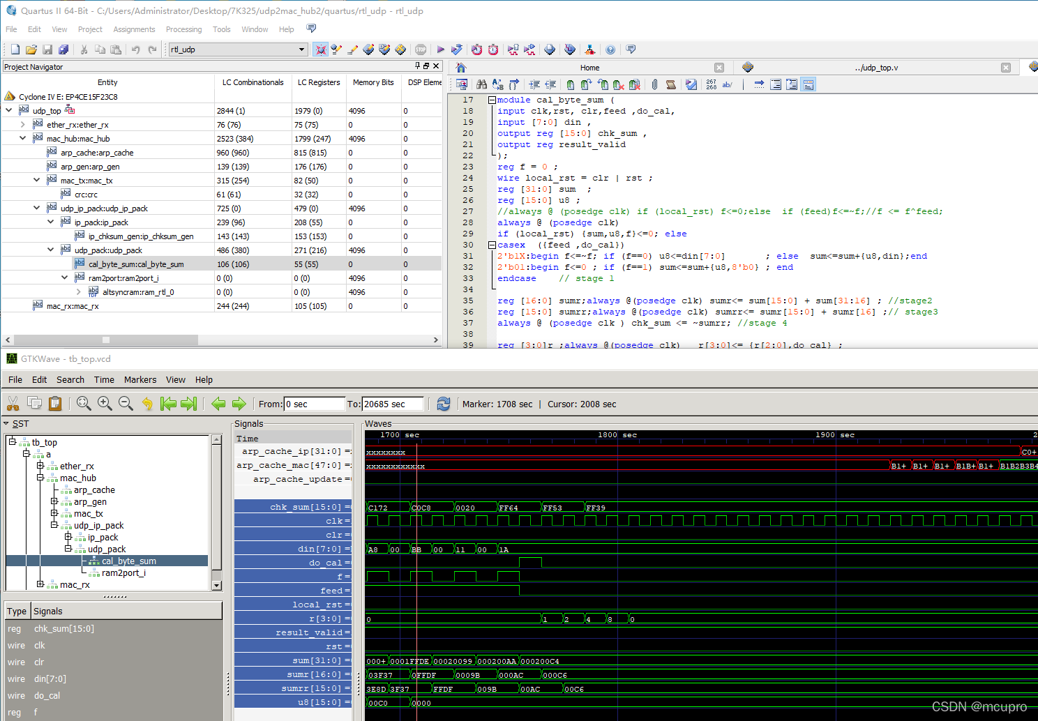 我们仿真依然使用icarvas verilog简称iverilog,查看波形依然使用gtkwave。在iverilog编译中发现什么错误会报出具体文件和具体行号,我们直接使用quartus根据视窗的模块(如上图)层次显示直接打开对应的代码。