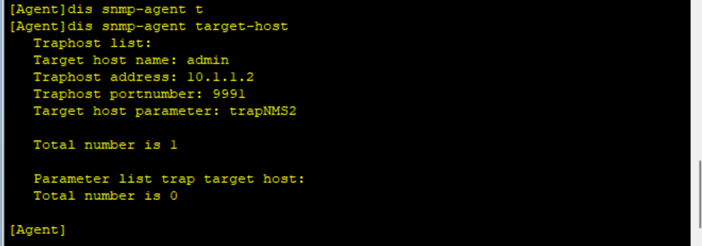 [Agent]snmp-agent target-host trap-hostname admin address 10.1.1.2 udp-port 9991 trap-paramsname trapNMS2