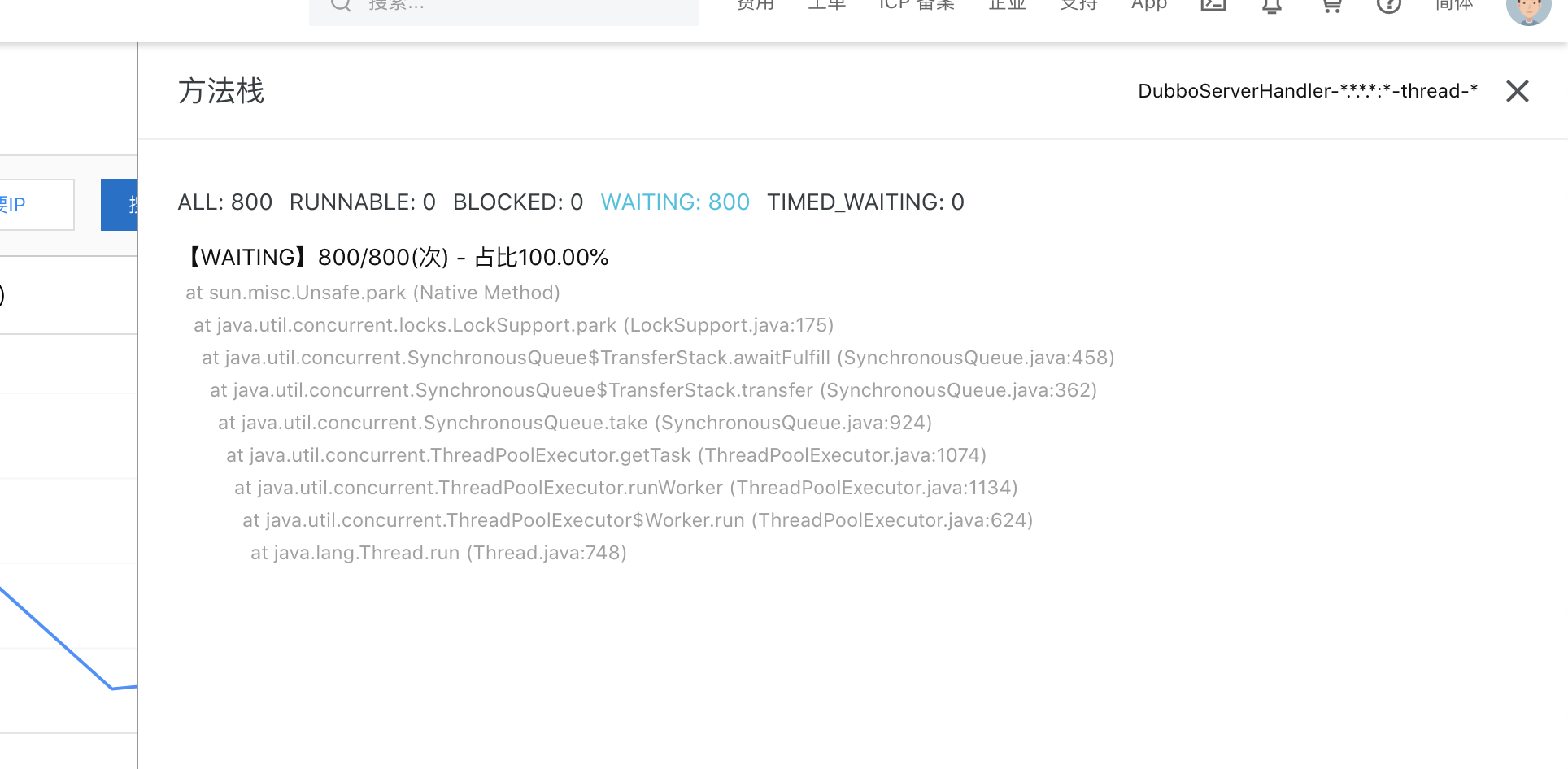"DubboServerHandler-10.96.142.17:20886-thread-176" #369 daemon prio=5 os_prio=0 tid=0x00007fabb801d000 nid=0x174 waiting on condition [0x00007fab2e284000]