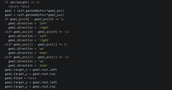 每一次交换拼图块时,我们需要判断是否有连续一样的三个及以上拼图块,代码实现如下: