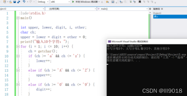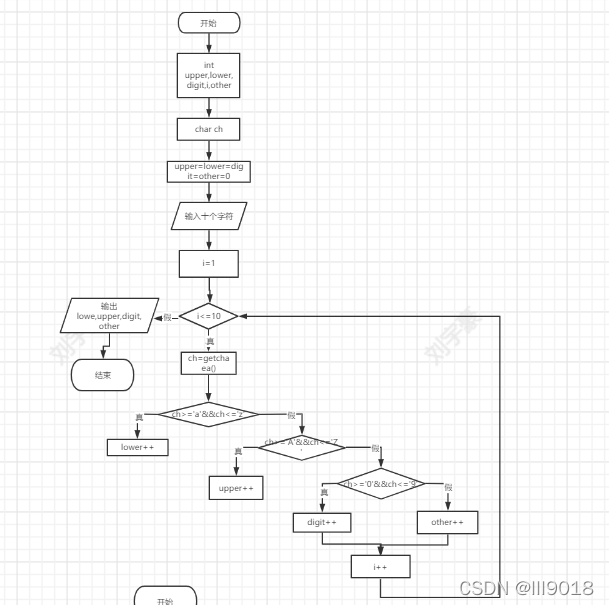 (2)程序中使用字符输入函数getchar()读入字符,使用多分支if结构实现分支,用逻辑表达式判断字符的种类。