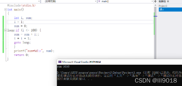 说明:语句标号是一个有效的标识符,使用时在语句标号的后面跟一个“:”出现在函数中某语句的前面。出现执行到goto语句时,会控制跳转到该语句标号处,达到控制循环的目的。