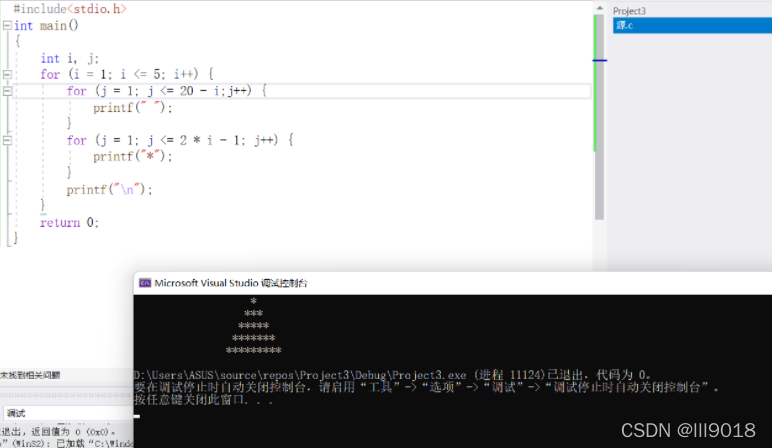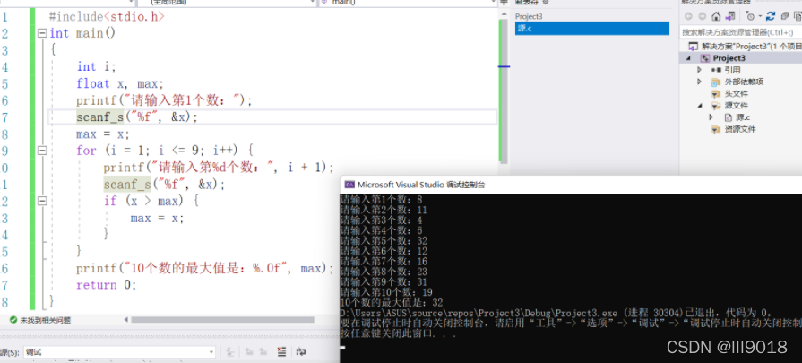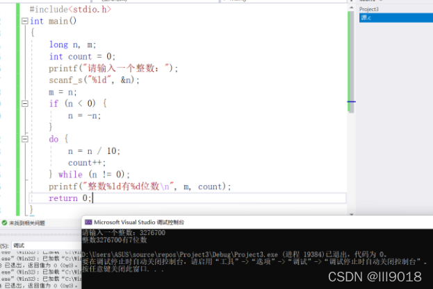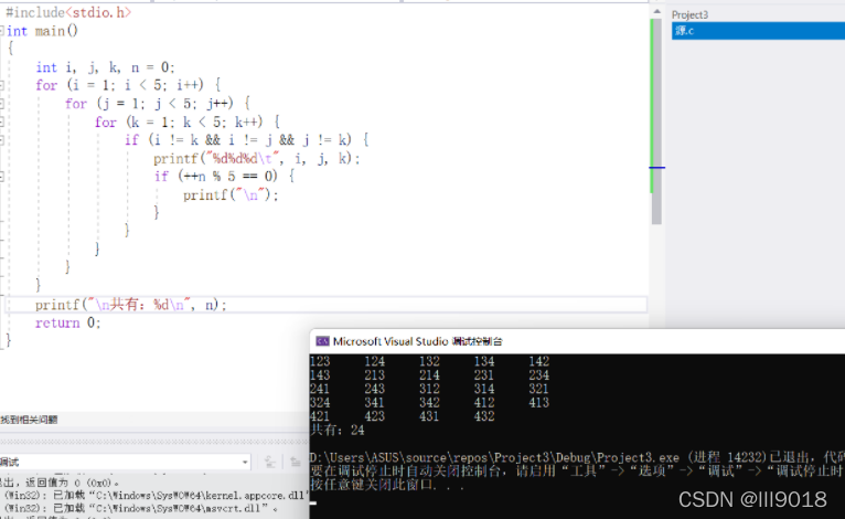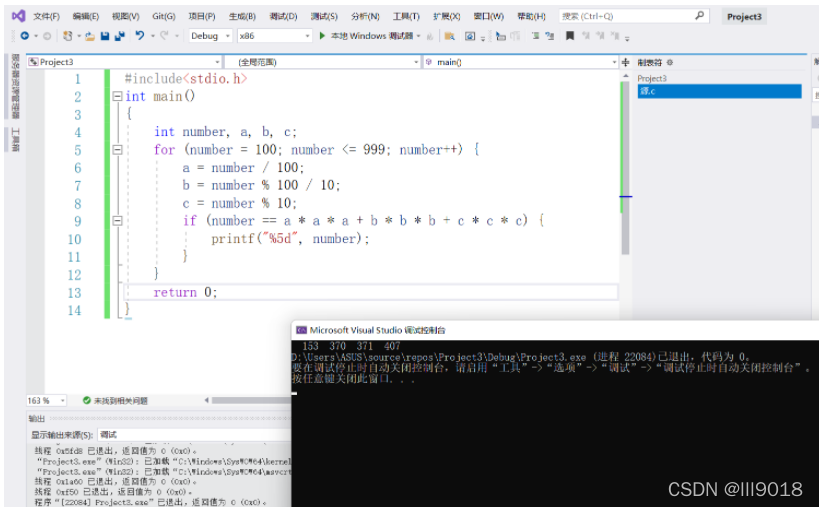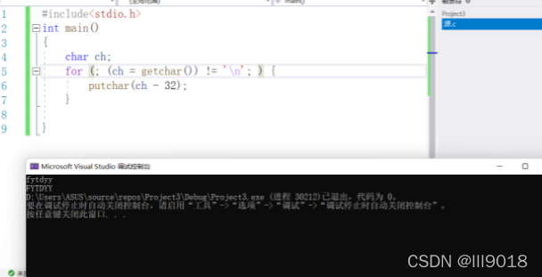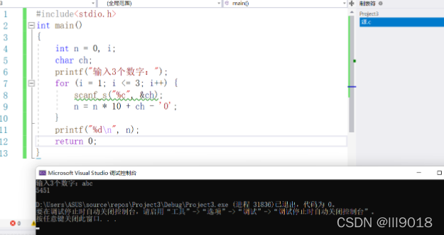 说明:(1)程序中使用的是在for循环语句中读入字符,所以键盘输入3位数字字符时,应连续输入,数字字符之间不能出现空格。如果输入空格或回车符,由于%c表示要读入一个字符,而空格或回车键本身也是一个字符,因此会被作为输入字符。