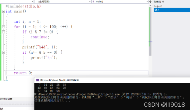 说明:(1)“if(i%7!=0)continue;”语句的功能是:如果n不能被7整除,则结束本次循环,转而执行“i++;”,继续下一次循环。