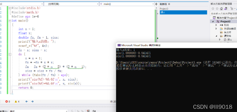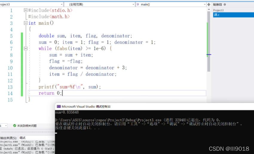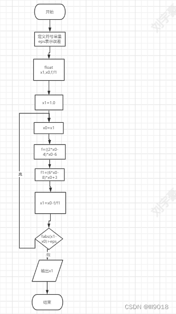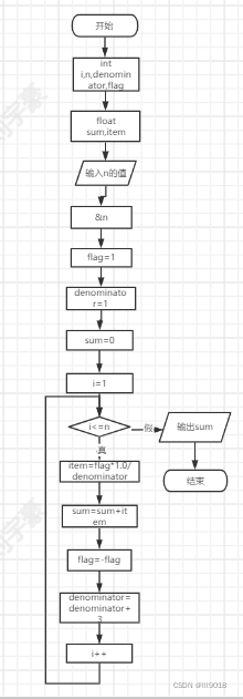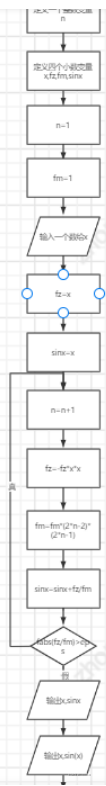 说明:while语句是3种循环结构之一,while后括号中的表达式称为循环条件,循环开始时,一定要保证循环条件为真。需要重复执行的语句组成了循环体,本例中循环体部分是要重复计算item的值,然后将其值与要求的精度进行比较,决定是否结束循环.