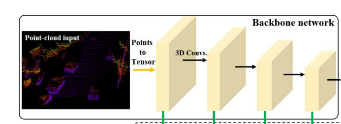 1、红色框中的黑色点表示原始点云坐标,黄色点表示上面的每一层3Dfeatures上的不为空的voxel,根据索引和与点云坐标的量化关系得到的坐标点以及特征。(也就是由voxel索引到点云坐标的映射,然后对应的点云坐标上的点的特征就是该voxel的特征。)