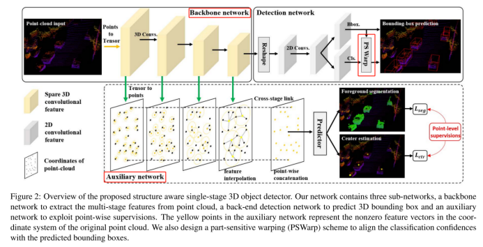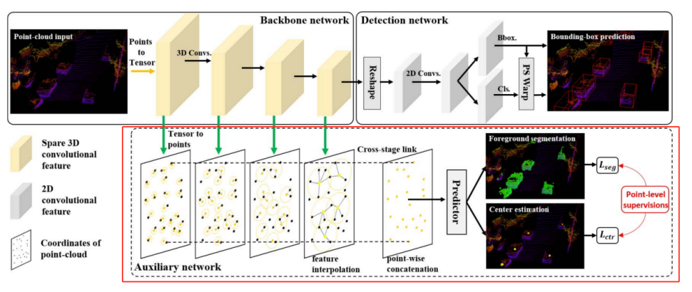 本文将PVRCNN中采样点特征的方法和R-FCN中联立Cls branch和BBox branch的方法融合到自己的方法中,大的创新点并没有,但是思路还是比较新颖,之后可以借鉴辅助模型和联立两大分支的思路。
