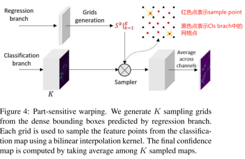 同时,我们将每个feature-map位置的预测边界框划分为K个子窗口,并选择每个子窗口的中心位置作为sample point。这样,我们可以生成K个采样网格![]()