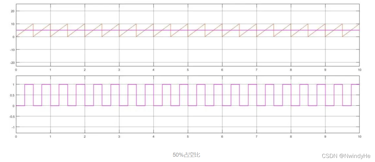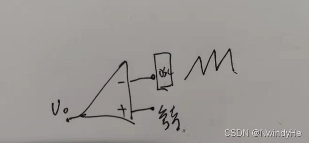 将5V作为比较器反向参考电压,给比较器同相参考电压输出0~10V的锯齿波,当锯齿波电压小于参考电压则输出低电平,而当锯齿波大于参考电压时比较器输出高电平。