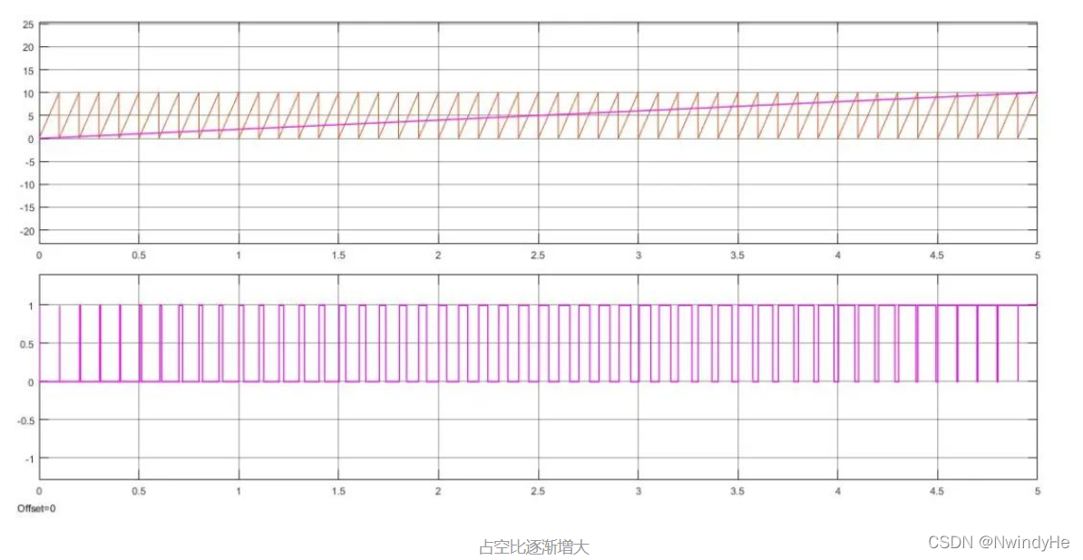 当我们从反相端接锯齿波,大于参考电压输出为0,而小于参考电压为1,通过改变参考电压的值,从而产生了不同占空比的信号。
