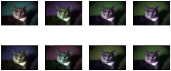 apply(img,torchvision.transforms.ColorJitter(brightness=0,contrast=0,saturation=0,hue=0.5))