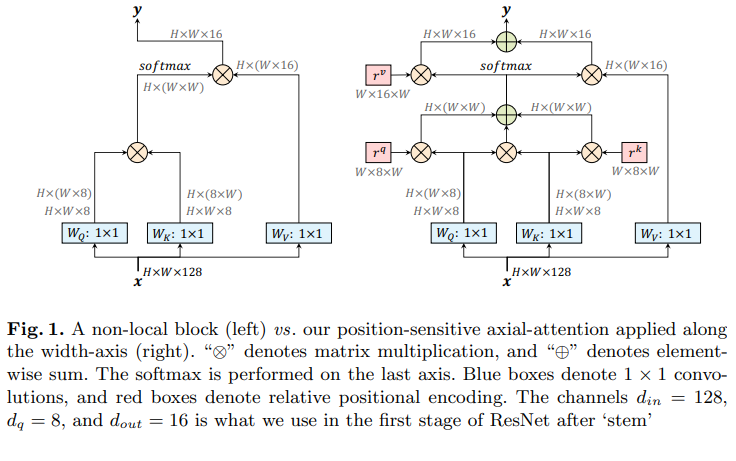 在本工作中,在独立的自注意中采用轴向注意,既保证了全局连接,又保证了高效的计算。具体来说,首先将图像的宽度轴上的轴向注意层定义为简单的一维位置敏感的自注意,并对高度轴使用类似的定义。具体来说,沿宽度轴的轴向注意层定义如下: