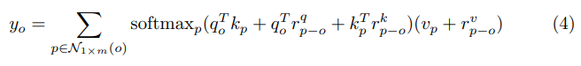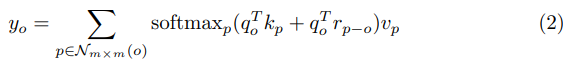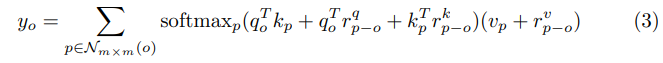 此外,一个学习到的相对位置编码项被合并到 affinities 中,产生一个动态的 ‘在接受区应该看哪里’ 的先验 (即,局部 mxm 的区域)。[65] 提出的方法可表示为公式