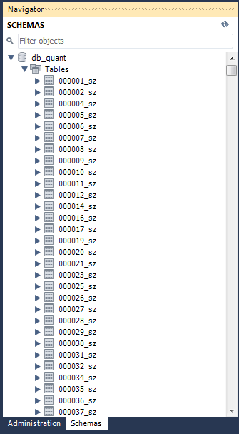 可以看到MySQL中包含了我们创建db_quant数据库,点击db_quant左侧下拉三角,再点击其下方Table左侧的下拉三角,就可以看到我们创建的所有股票的表: