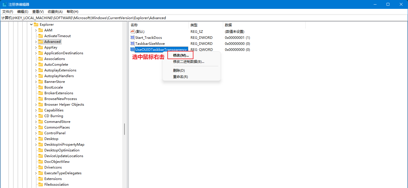 6、接着空白处鼠标右击新建一个‘’DWORD64位值”,将它命名为UseOLEDTaskbarTransparency