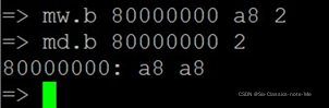 直接举例说明,向内存 0x80000000 的地址写入 2 个 8 位数据 a8,然后使用 md 命令查看是否写入成功: