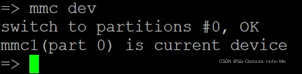 使用 mmc dev 命令可以查看当前选中正在使用的 mmc 设备,mmc dev