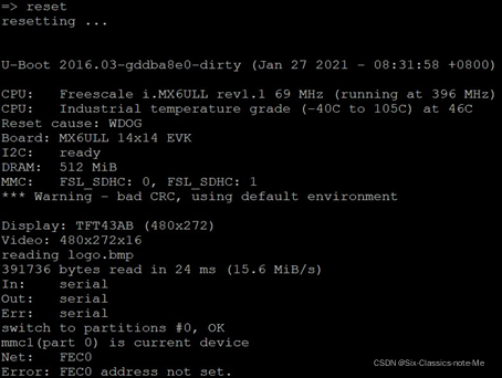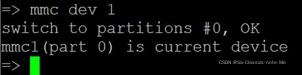 切换成功之后,现在使用的就是 SD 卡(TF 卡)设备,此时使用的 mmc 命令都是对 SD 卡进行的操作。为了使用 eMMC 进行命令使用举例演示,我们再将 mmc 设备更换为 eMMC: mmc dev 1