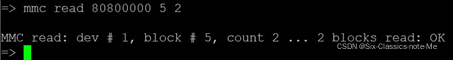 起始块号,cnt 是块数目。举例,从 mmc 第 5 块开始读取 2 块的数据到内存 0x80800000: mmc read 80800000 5 2