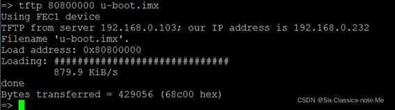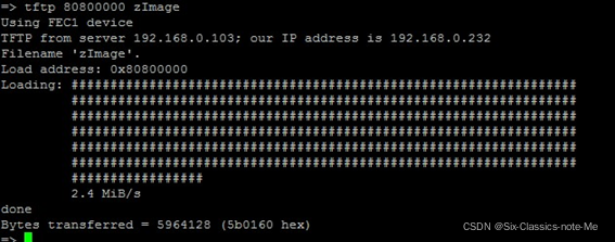 网络通了之后,就可以使用 tftp 命令将 Ubuntu 的 tftp 共享文件夹中的 zImage 和.dtb 下载到开发板内存中,使用命令将内核 zImage 下载到内存的 0x80800000 地址: