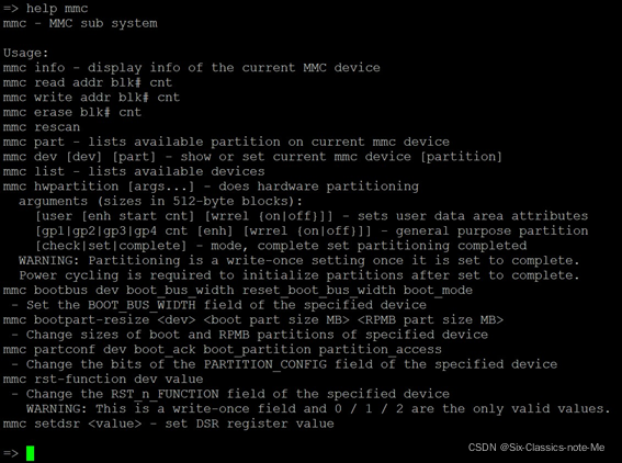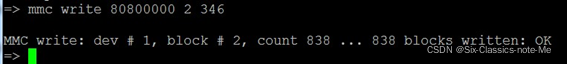 4)mmc write 顾名思义,mmc write 是向 mmc 中写入数据,mmc write addr blk# cnt,其中 addr 是存放数据的内存地址,blk#是要写的 mmc 的起始块号,cnt 是块数目。
