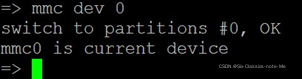 当前选中正在使用的是mmc1设备的0分区,即eMMC Flash的0分区,此处的0分区其实是指eMMC Flash 的用户分区(用户分区的概念在以下 mmc write 章节会有说明)。使用 mmc dev 切换到使用 SD 设备: mmc dev 0