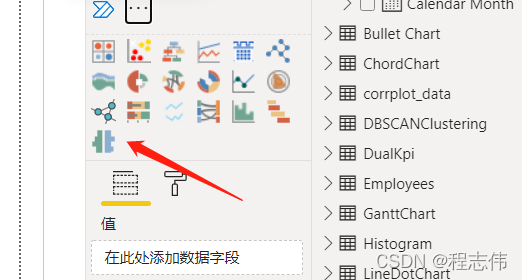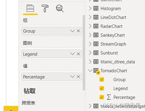 5. 单击“可视化”窗格中的“龙卷风图”图标, 在画布区域会出现该图的模板, 由于没有填入数据, 因此图是灰色的。