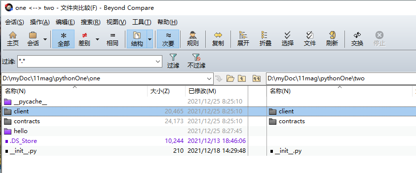 比如,在Beyond Compare过滤.DS_Store文件、hello文件夹、__pycache__文件夹,只需要在Beyond Compare里的过滤栏,输入如下命令,再按回车即可
